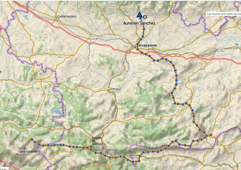 Sur sa route, Aurélien a pu compter sur le soutien de dizaines d'Audoises et d'Audois venus l'encourager, partager un bout de course à ses côtés, parfois même au coeur de la nuit ! D'autres l'ont suivi depuis les réseaux sociaux du Département ou en découvrant son avancée grâce au tracé satellite retransmis en direct sur le site aude.fr. Durant ces presque 2 jours, en route, il allait en effet être rejoint ici par un jeune d'Axat, là part des coureurs des clubs locaux audois, encore plus loin par des agents du service des sports du Département de l'Aude... Et, en fil conducteur, jamais loin, sa compagne Lucille, ultra-traileuse elle aussi.